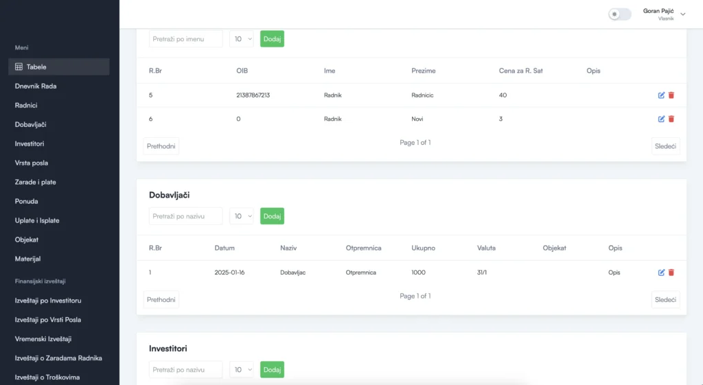 Aplikacija koja omogućava sveobuhvatno praćenje poslovanja — od evidencije materijala do upravljanja dobavljačima i investitorima — uz mogućnost generisanja detaljnih i prilagođenih izveštaja.